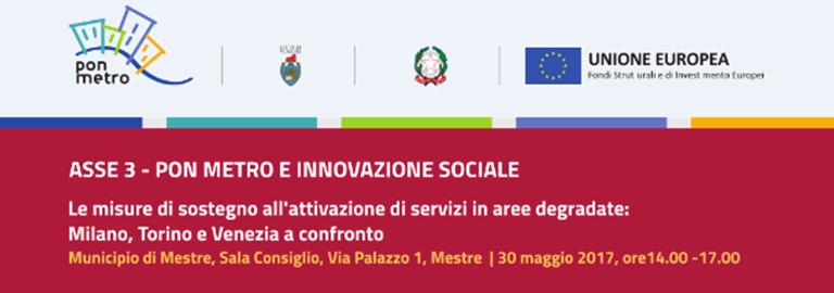 Il 30 maggio 2017, presso il Municipio di Mestre, si terrà l’incontro “Le misure di sostegno all’attivazione di servizi in aree degradate: Milano, Torino e Venezia a confronto“, promosso nell’ambito delle attività del PON Metro 2014-2020 relative all’Asse 3 “Inclusione sociale” dell’Autorità Urbana di Venezia. L’incontro, occasione di promozione a livello locale del PON Metro, si concentra sui temi dell’Innovazione sociale e coinvolge i referenti di altre due Autorità Urbane, Milano e Torino, per uno scambio di buone pratiche e con finalità di contaminazione per l’attivazione di progetti innovativi che vedano la partecipazione di altri stakeholder del territorio, quali attori istituzionali, università, incubatori e associazioni del terzo settore.
