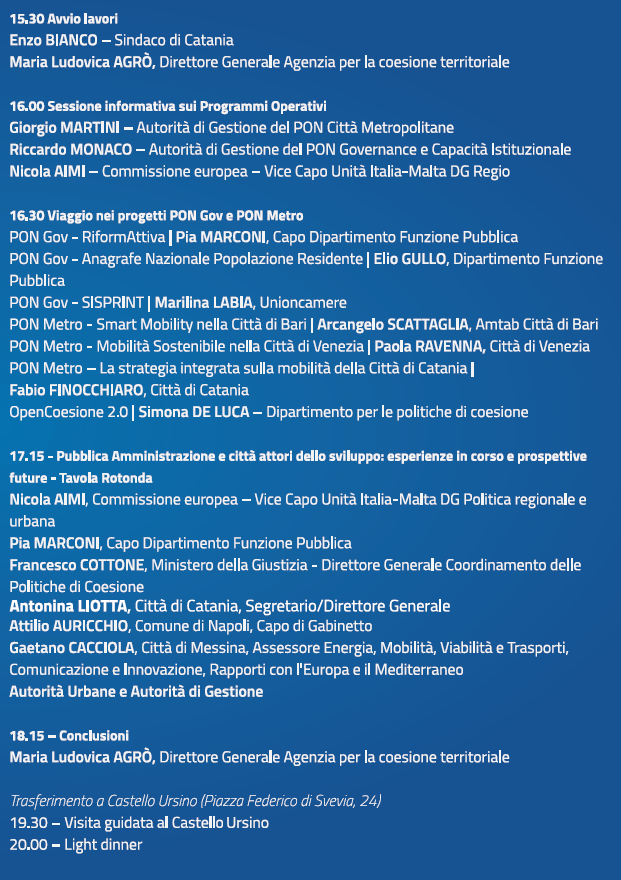Gli interlocutori chiamati al confronto su questi aspetti sono: Nicola Aimi, Commissione europea – Vice Capo Unità Italia-Malta DG Politica regionale e urbana; Pia Marconi, Capo Dipartimento Funzione Pubblica; Francesco Cottone, Ministero della Giustizia – DG Coordinamento delle Politiche di Coesione; Attilio Auricchio, Comune di Napoli, Capo di Gabinetto; Gaetano Cacciola, Città di Messina, Assessore Energia, Mobilità, Viabilità e Trasporti, Comunicazione e Innovazione, Rapporti con l’Europa e il Mediterraneo. Previsto anche il coinvolgimento estemporaneo dei rappresentanti delle Autorità Urbane presenti e delle Autorità di Gestione.