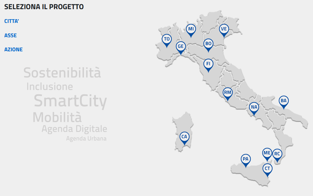 Progetti e soluzioni che contribuiscono al miglioramento della qualità della vita non solo delle 14 città metropolitane ma anche delle cinture dei comuni interessati. Le progettualità ed il loro iter sono in costante aggiornamento sul sito del PON Metro dove è possibile visitare la sezione “Consulta i nostri progetti” che presenta non solo una parte descrittiva ma anche l’andamento finanziario di ogni intervento relativamente ai quattro passaggi fondamentali del complesso percorso attuativo di un progetto europeo. Per chi si accinge alla navigazione è necessario chiarire che per esigenze di sintesi si definisce come “Programmato”, l’importo finanziario del progetto stabilito all’interno del Piano Operativo della città; “Ammesso a finanziamento”, l’importo relativo al progetto per il quale il beneficiario, ottemperando agli adempimenti di propria competenza, ha provveduto alla firma del provvedimento con il quale sarà impegnata la relativa somma a valere sulle risorse del Programma, dando così avvio all’attuazione dell’intervento. Il terzo passaggio che sul sito viene indicato come “Giuridicamente vincolante” indica il valore finanziario del/dei contratti sottoscritti con i fornitori rappresentando così un ulteriore avanzamento dell’iter progettuale. Infine l’ultimo indicatore è relativo ai “Pagamenti” quindi al valore della spesa effettuata.