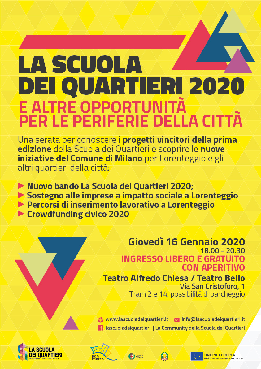 On line dal 15 gennaio 2020 il secondo bando della Scuola dei Quartieri 2020 che prende vita da un progetto Pon Metro su cui il Comune di Milano ha deciso di investire, per migliorare il contesto periferico della città, attraverso iniziative che arrivano direttamente da quel territorio grazie all’intraprendenza degli abitanti.