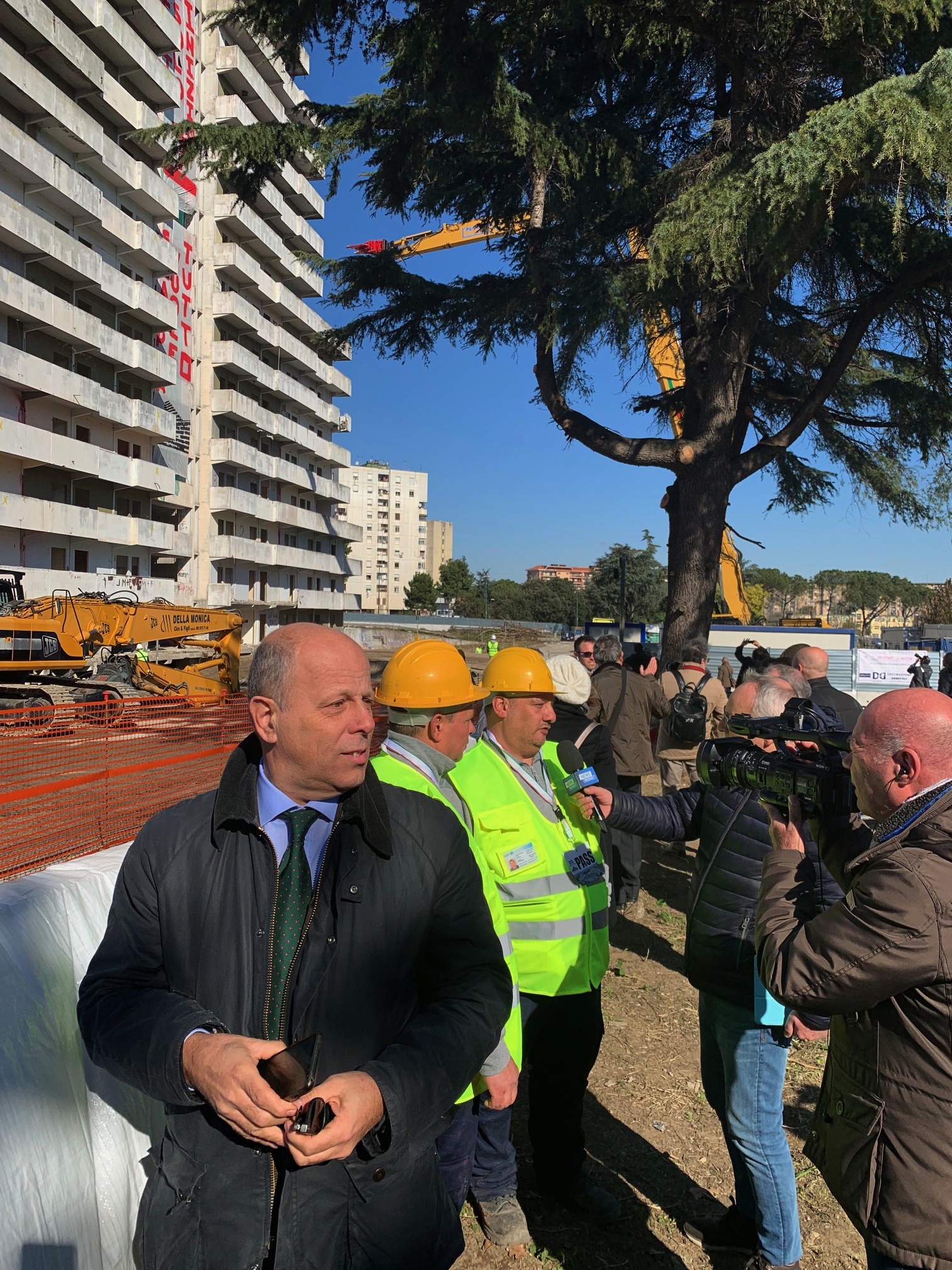 Una svolta storica che riporta Scampia all’anno zero. Con un po’ di ritardo sull’orario previsto, la pinza PMI 980 super long demolition, montata sulla gru cingolata che raggiunge 52 metri di altezza, ha iniziato a demolire la vela A, più conosciuta come vela verde, che fa parte di un complesso realizzato negli anni ’80, su progetto di Franz di Salvo, inizialmente composto da 7 edifici su due lotti: il lotto L, che ne accoglieva tre, e il lotto M, su cui ne furono realizzati quattro.