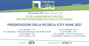 Il panel di presentazione della ricerca #ICityRank2021 si confronterà attorno alle domande: che peso avranno le città ora nel percorso di ripartenza? Come potranno accompagnare quella transizione digitale e sostenibile auspicata dal #PNRR? Nel corso dell’evento saranno presentati gli esiti della ricerca ICity Rank 2021 che, confermando l’approccio metodologico inaugurato lo scorso anno, restituisce l’avanzamento dei capoluoghi italiani nell’indice di trasformazione digitale e negli indici settoriali che lo compongono (servizi online, app municipali, digital pa, social pa, open data, trasparenza, wi fi, IoT e tecnologie di rete).