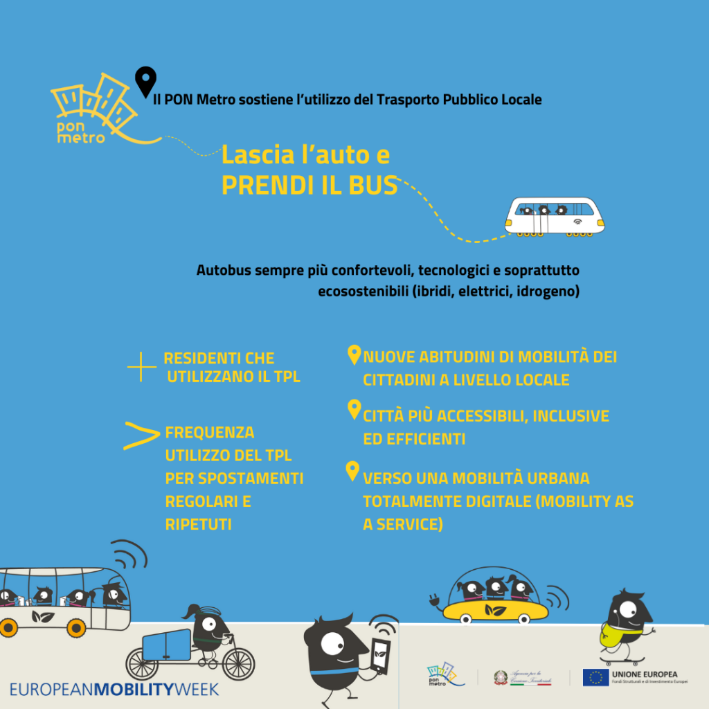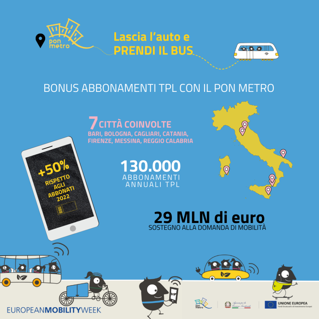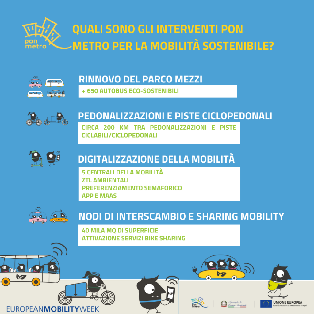 Con circa 600 mln di euro di risorse assegnate ad azioni a supporto della Mobilità Sostenibile e oltre 200 progetti attuati, il Pon Metro 2014-2020 in coerenza con gli obiettivi prefissati e in risposta ai target di decarbonizzazione europei, incide su alcuni nodi critici di sviluppo nelle 14 città metropolitane, individuati nell’ambito dell’Agenda urbana nazionale. Tra questi l’applicazione del paradigma “Smart city” per il ridisegno e la modernizzazione dei servizi urbani per i residenti e gli utilizzatori delle città (Obiettivi tematici 2 e 4).