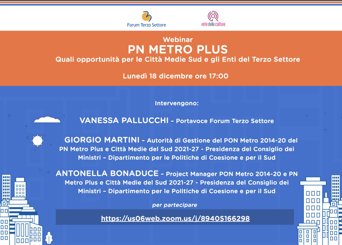 Oggi, 18 dicembre, alle ore 17 il webinar “PN Metro Plus – Quali opportunità per le Città Medie Sud e gli Enti del Terzo Settore” di approfondimento sul Programma Nazionale organizzato dal Forum Terzo Settore per promuovere gli interventi promossi dal Programma con un particolare focus sulle azioni di sviluppo urbano destinate alle Città Medie Sud.