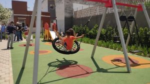 Nello spazio restituito all’utilizzo dei cittadini si è proceduto alla messa a dimora di alberi di Giuda, Grevillea, ibisco e alloro e di diversi tipi di arbusti e piante fiorite (Rosmarinus officinalis prostrato, Lavanda officinalis, Abelia grandiflora, Laurus nobilis, Laurus nobilis Viburnum, Rosa ‘Michele Cantatore’, Agapanthus africanus bianco, Agapanthus africanus blu, Verbenahybrida e Lippia nodiflora), alla creazione di un’area con pavimentazione anti trauma sulla quale sono stati installati un’altalena a doppia seduta, un gioco munito di scivolo e un gioco a molla. Sono stati inoltre posizionati cestini portarifiuti e panchine, oltre a una fontana inclusiva.
