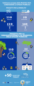 - 230 i progetti realizzati per importo complessivo di 550 milioni di euro. Di questi 150 milioni di euro circa 110 progetti sono orientati alla conversione e messa in sicurezza dello spazio pubblico in favore di pedoni e ciclisti.