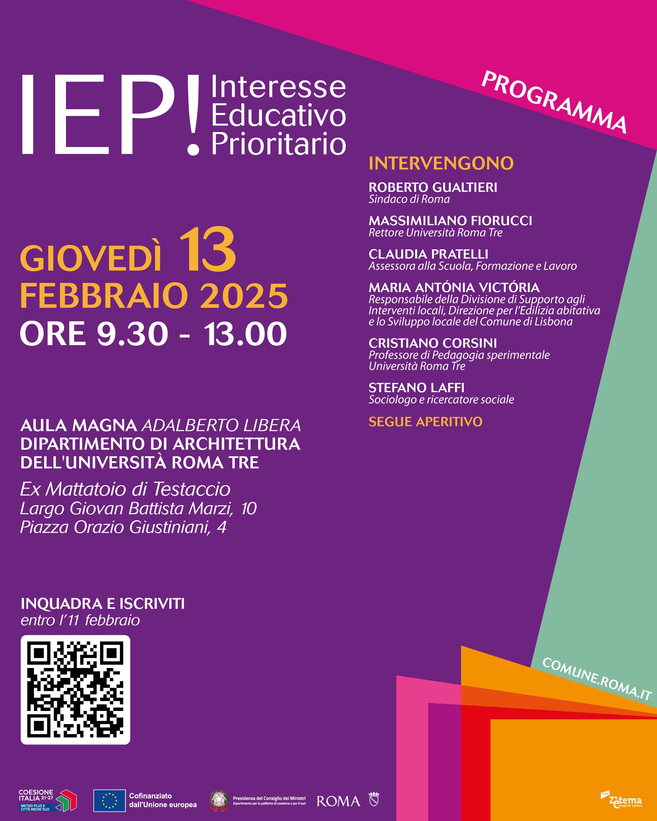 Presentato ufficialmente dal Sindaco di Roma, Roberto Gualtieri e dall’Assessora alla Scuola, Formazione e Lavoro, Claudia Pratelli, presso l’ex Mattatoio di Testaccio nell’Aula Magna di architettura, il progetto IEP! Interesse educativo Prioritario interviene su cinque territori dove è emerso un bisogno maggiore: Labaro, Fidene, Quadraro/Torpignattara, Borghesiana, Ostia Nord. Il focus di IEP! è lo sviluppo di azioni contro la povertà educativa e la dispersione scolastica, migliorando l’offerta di opportunità culturali nei territori più fragili.