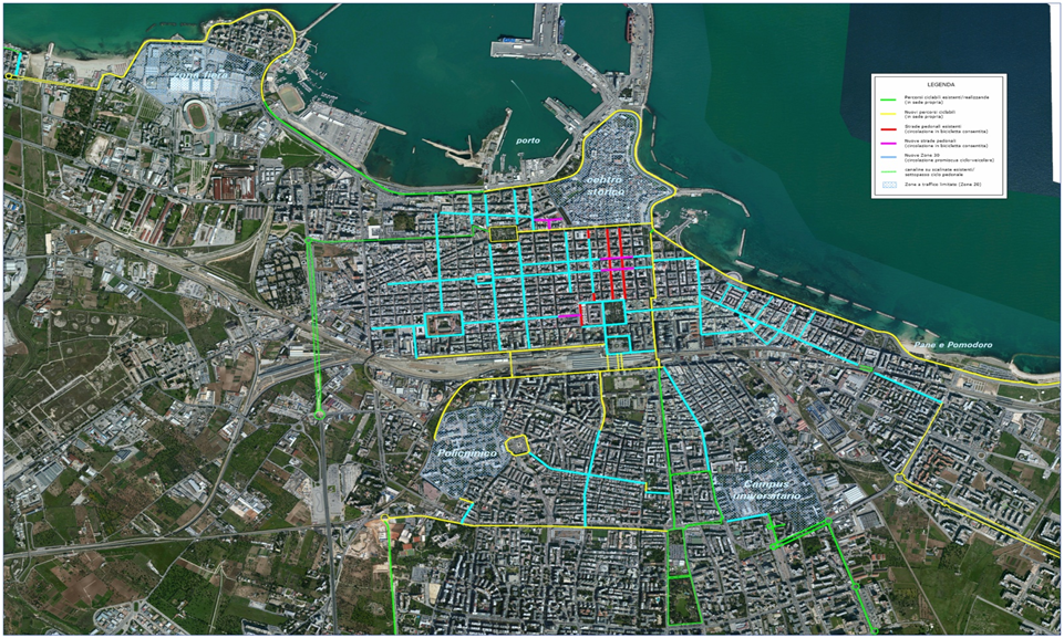 Le soluzioni miranti a promuovere modelli di mobilità sostenibile prevedono anche il potenziamento della rete ciclabile, attraverso l’individuazione di una serie di nuovi tracciati di percorsi ciclopedonali. A tal proposito il comune di Bari ha redatto un Biciplan (Cycling Mobility Plan Of The City of Bari) dove è indicata l’intera rete di piste ciclabili in parte già realizzata e in parte da realizzare entro il 2020. Il principio ispiratore del Biciplan è di ridisegnare l’intero assetto viario della città di Bari incrementando il numero di strade a misura di ciclista e pedone introducendo isole ambientali e interventi di trafic calming.