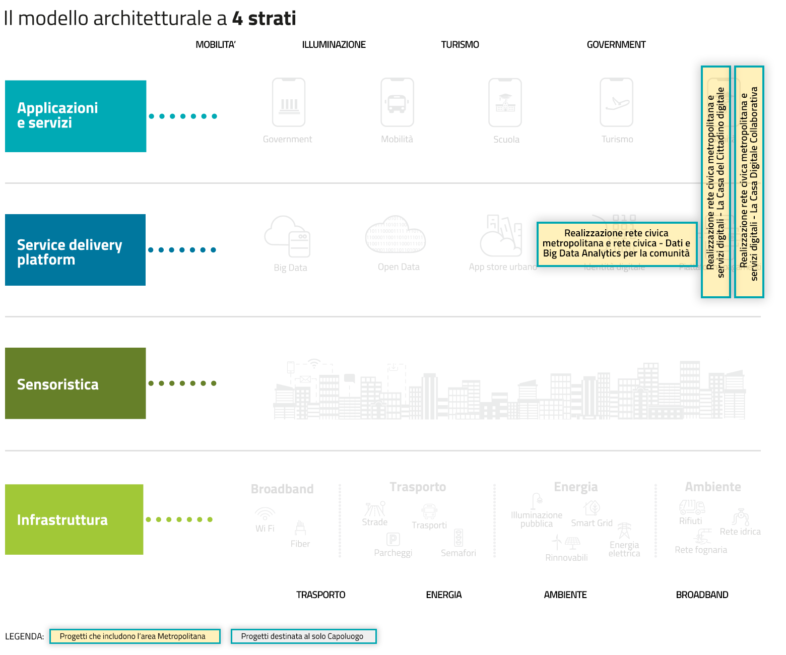 L’analisi riporta i progetti dell’Asse I – “Agenda Metropolitana” e dell’Asse 2 – “Sostenibilità dei servizi pubblici e della mobilità urbana” contenuti nel Piano Operativo, e la loro coerenza con una strategia per strati nella costruzione della metropoli smart, in modo da evidenziarne l’impatto sui punti di forza e debolezza.
