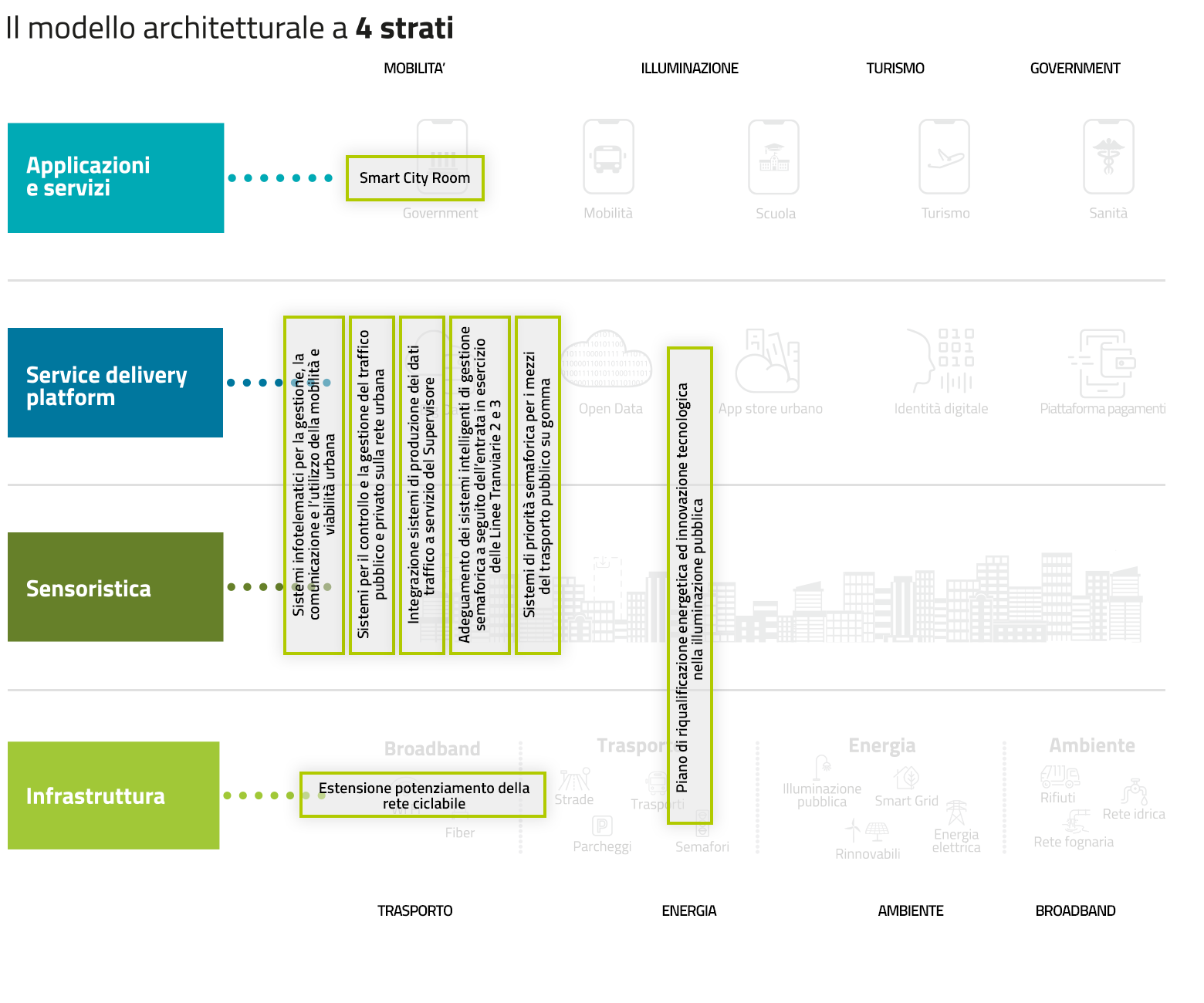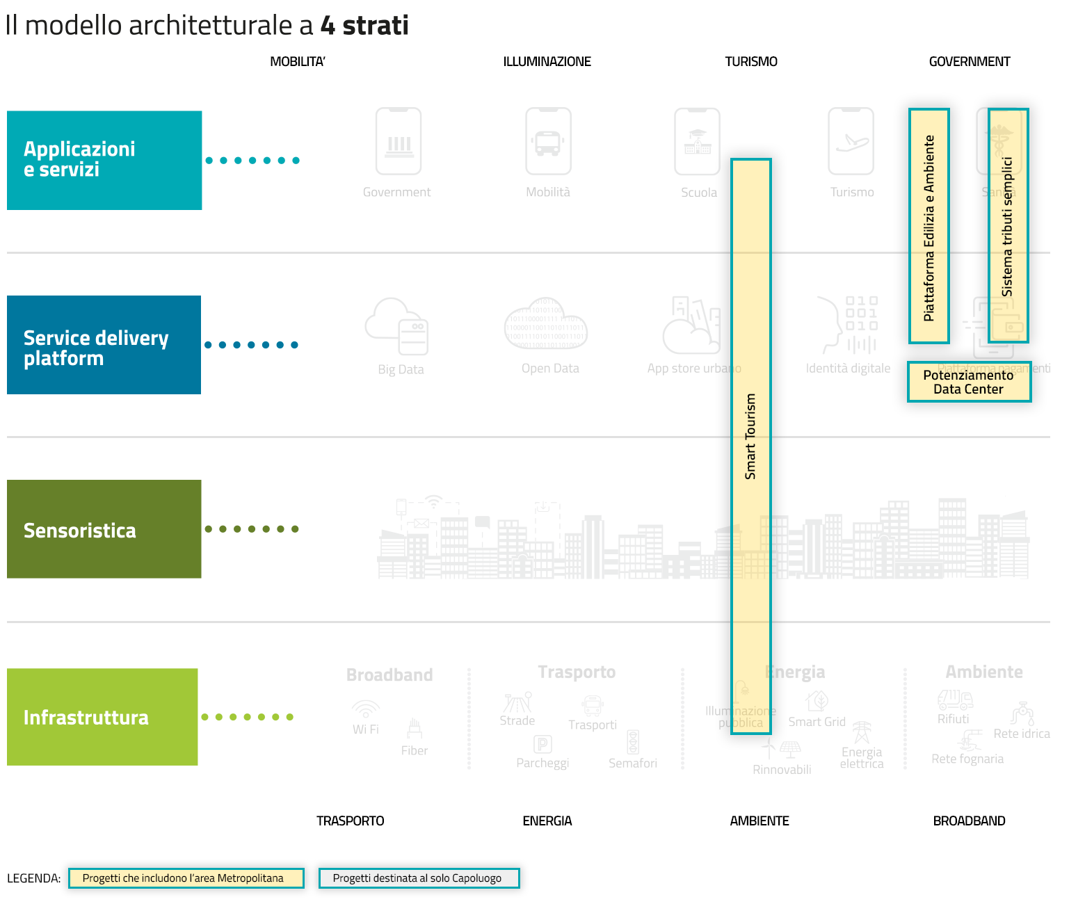 L’analisi riporta i progetti dell’Asse I – “Agenda Metropolitana” e dell’Asse 2 – “Sostenibilità dei servizi pubblici e della mobilità urbana” contenuti nel Piano Operativo, e la loro coerenza con una strategia per strati nella costruzione della metropoli smart, in modo da evidenziarne l’impatto sui punti di forza e debolezza.