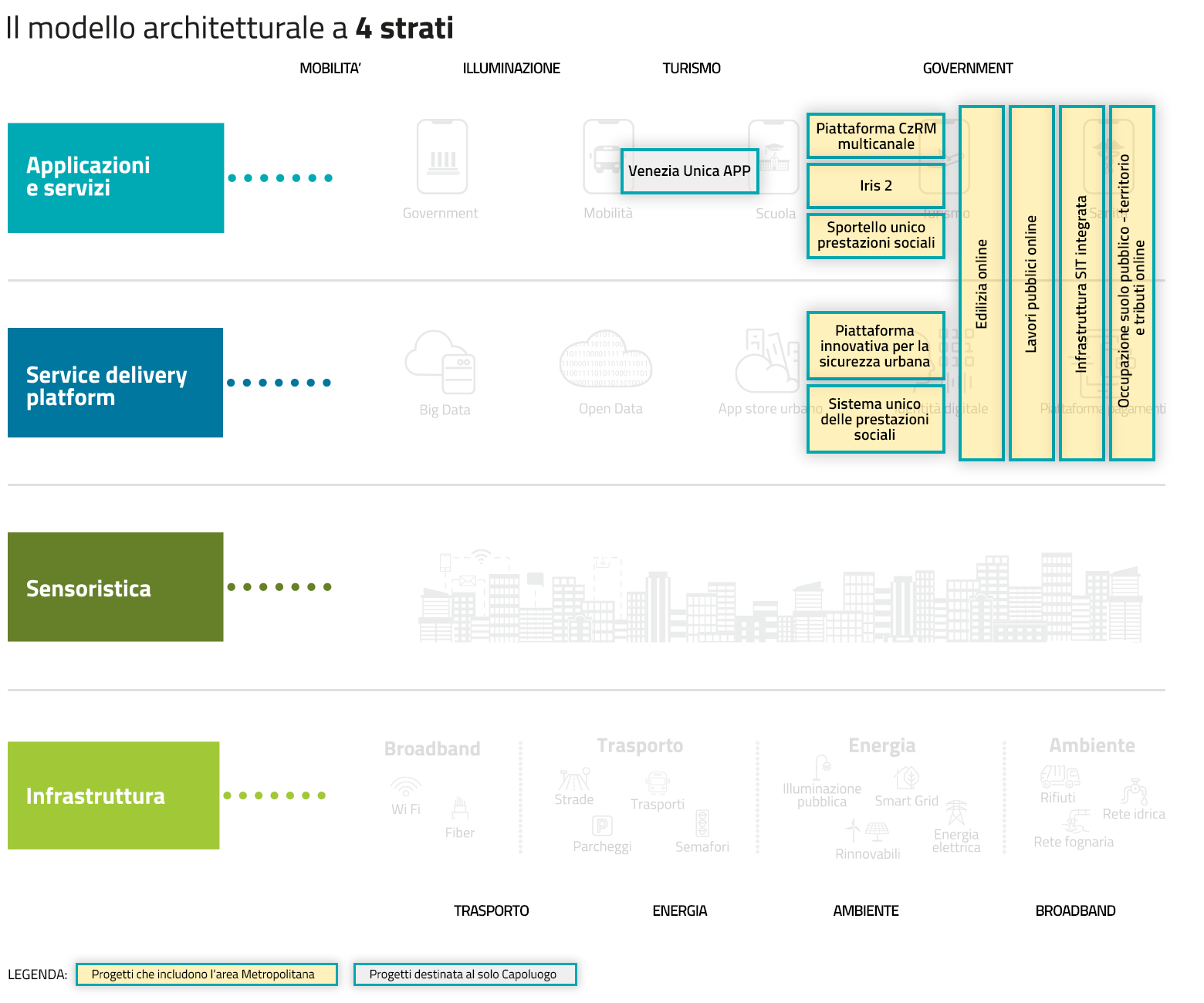 Le scelte di intervento del Piano Operativo dell’Asse 1 prevedono progetti indirizzati al miglioramento delle applicazioni e dei servizi con riflessi diretti su tutti i city users. Il progetto PON Metro del Comune di Venezia integra azioni tipiche dell’Agenda Digitale che riguardano il turismo ed il government. La volontà del capoluogo veneto è quella di incrementare i servizi di government ai fini di inclusione sociale ed amministrazione pubblica.